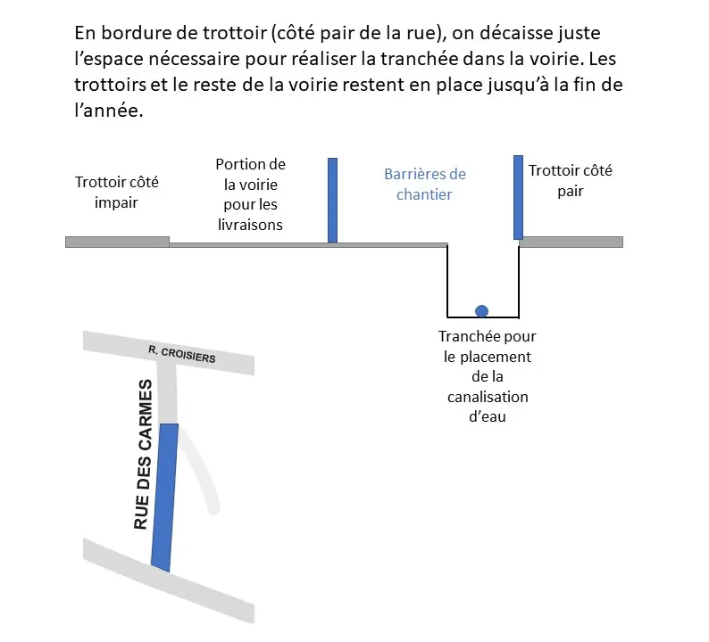 A partir du 5 août, le tronçon de la rue des Carmes, entre la rue des Croisiers et la rue Saint-Joseph sera en chantier.